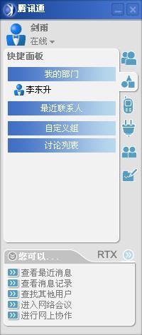 腾讯通RTX是(Real Time eXpert)是腾讯公司推出的最新企业级实时通信平台,致力于帮助企业提高运作效率、降低沟通成本、拓展商业机会,是一种高度可管理、低成本、易部署的IT平台。RTX集成了丰富的沟通方式,包括文本会话、语音/视频交流、手机短信、文件传输、IP电话、网络会议、以及应用程序共享、电子白板等远程协作方式。